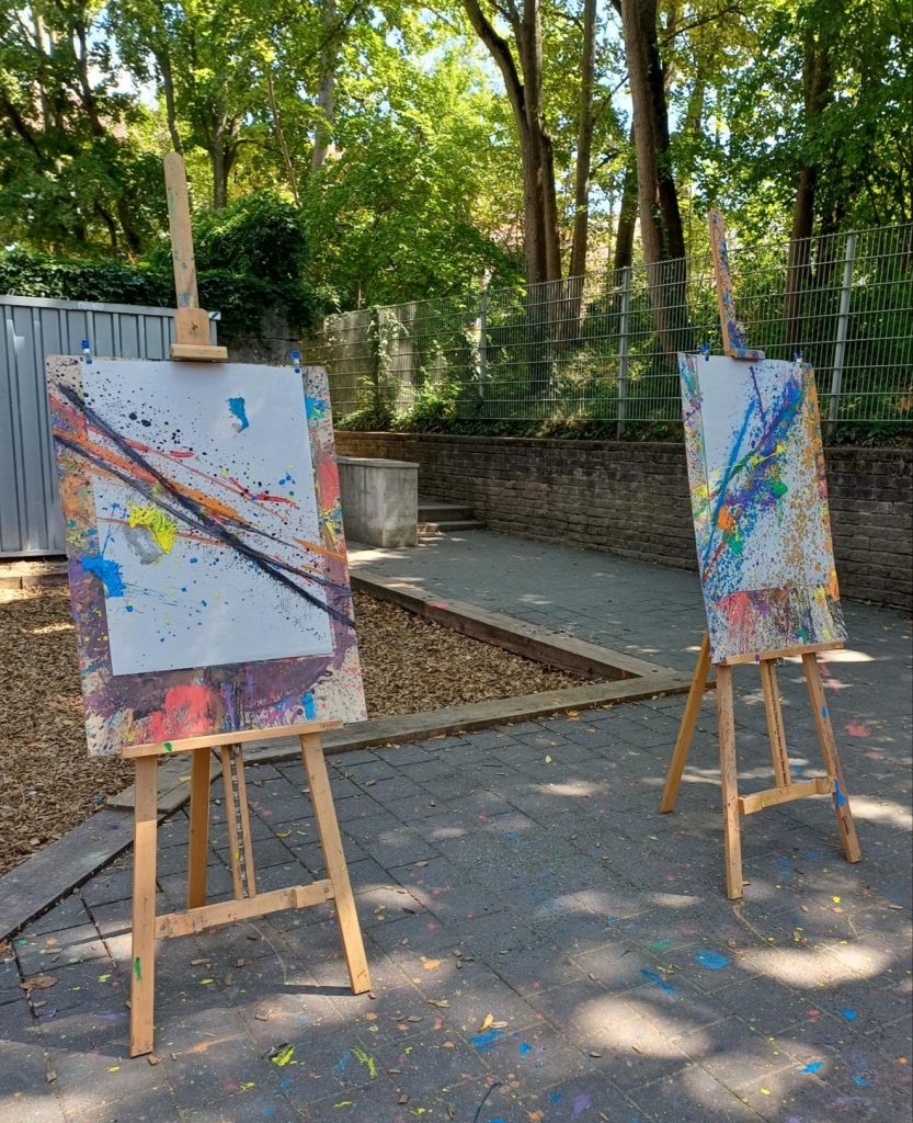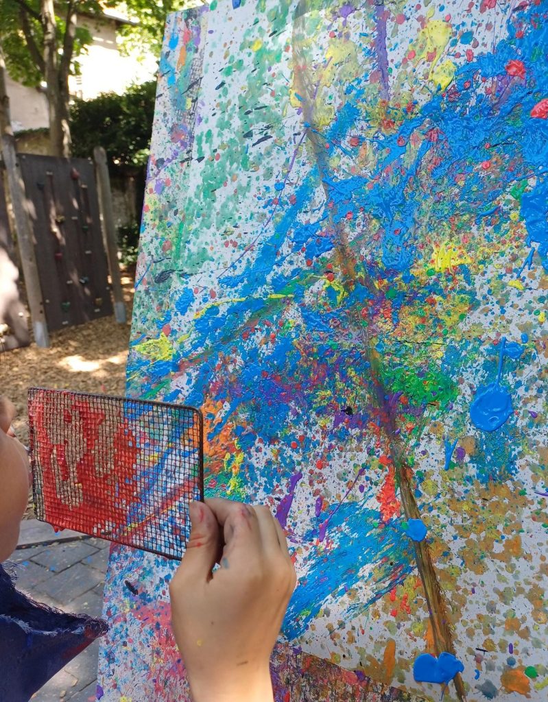In der 5. Ferienwoche konnten sich die Kinder mit Action-Painting an Staffeleien austoben. Unter freiem Himmel und zu Musik wurde die Farbe mit vollem Körpereinsatz und verschiedenen Materialien auf die Malfläche gespritzt und geschleudert.